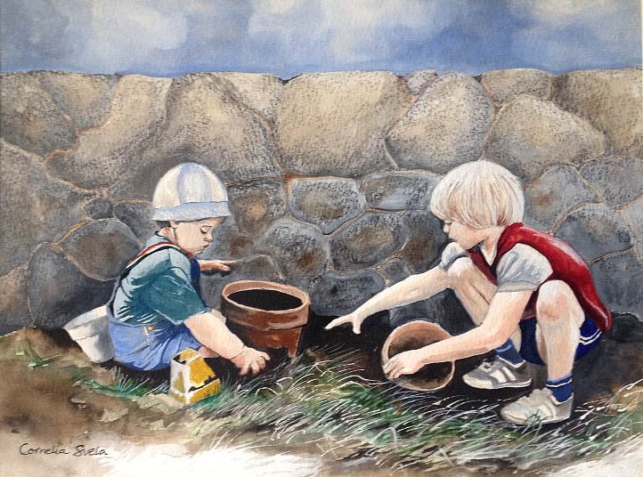 Moments like a day at home when she captured this moment of her two young boys playing in the garden. She painted this piece using watercolor. It's of her two young boys that are now grown-ups with babies of their own.